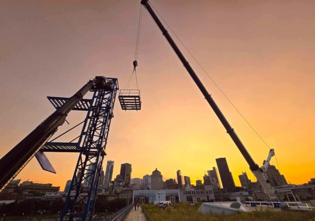 About: A 650-tonne Liebherr LTM 1500-8.1 helps to erect a 90-foot tower crane base at the Port of Montreal for the Red Bull Cliff Diving World Championship.