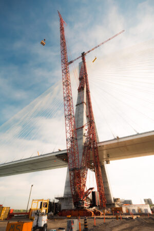 About: Mammoet’s Tadano CC 38.650 crawler crane helps with dismantling one of the Comansa tower cranes that helped in building the Gordie Howe International Bridge over the last five years.