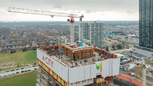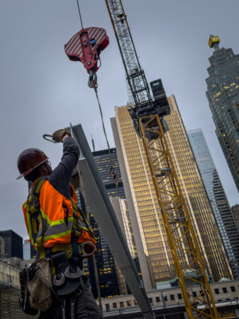 About: A Liebherr luffing jib tower crane installs steel beams on a rooftop in the downtown core of Toronto as part of a renovation project.
