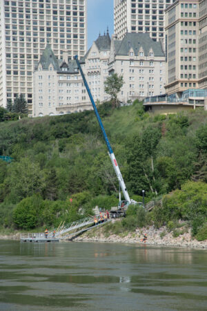 About: Encore’s Western Star 4800SB, equipped with a Manitex 45155SHL picker, lifting and installing a floating dock system on the shores of the North Saskatchewan River at Louise McKinney park, with the Fairmont Hotel Macdonald in the background.