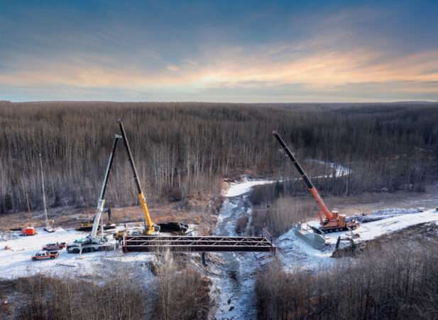 About: LaPrairie put their Demag AC-200 240-ton, Grove GMK6220 275-ton and 500-ton Liebherr LTM-1440 to work as part of their replacement of the five-span Sweathouse Creek Bridge for the Alberta Ministry of Transportation and Economic Corridors.