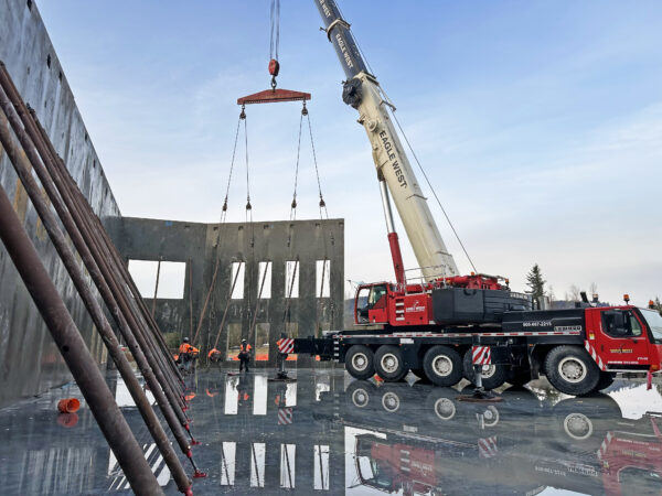 About: Crews assist Eagle West’s Liebherr LTM 1220 hydraulic crane, equipped with counterweight, in hoisting tilt panels on a job site.