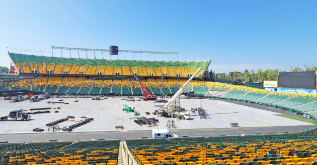 About: TNT’s Liebherr 1160-5.2 and Demag AC160-2 tackled the stage and speaker tower set-up at Edmonton’s Commonwealth Stadium over two days to prepare for a concert by Metallica.