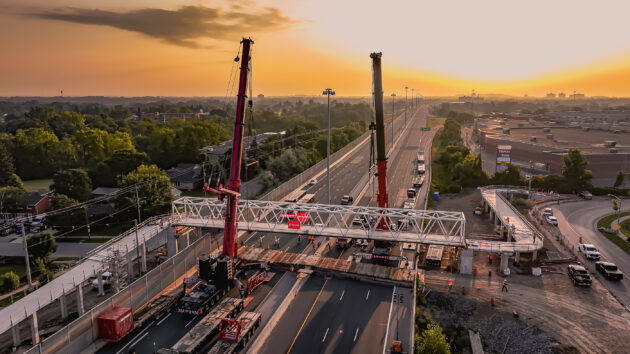About: Mammoet Canada’s Eastern team used a Demag AC500 and Liebherr LTM 1650, alongside Goldhofer trailers, to complete the lift and setting of a 213-ton pedestrian bridge across Ontario’s Highway 7/8.